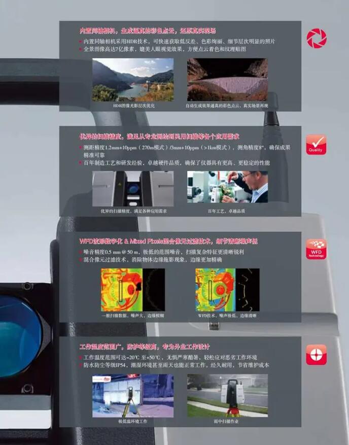徠卡測量系統(tǒng)打造的長測程三維激光掃描儀ScanStation P50,在繼承高精度的測角測距技術(shù)、 WFD波形數(shù)字化技術(shù)、 Mixed Pixels混合像 元技術(shù)和HDR圖像技術(shù)的同時,掃描距離提高至1km以上,使得徠卡ScanStation P50具有更長的測程和更強大的性能,滿足長距離及各種掃描任務(wù)需求。